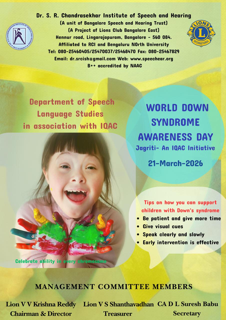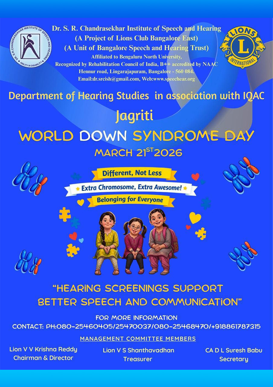 Dr.S.R. Chandrasekhar Institute of Speech and Hearing College stands as the academic pillar of the Bangalore Speech and Hearing Trust (BSHT).